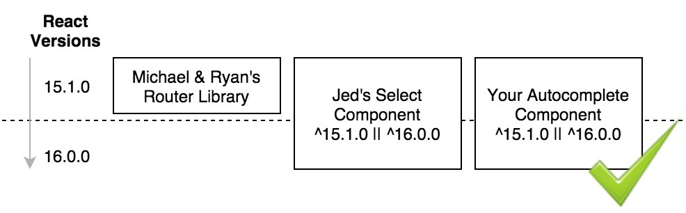 If you try to upgrade your component to 16.0.0 you might find that your application no longer works if you still have other dependencies. E.g. if Ryan’s and Jed’s components are only compatible with 15.x.x.