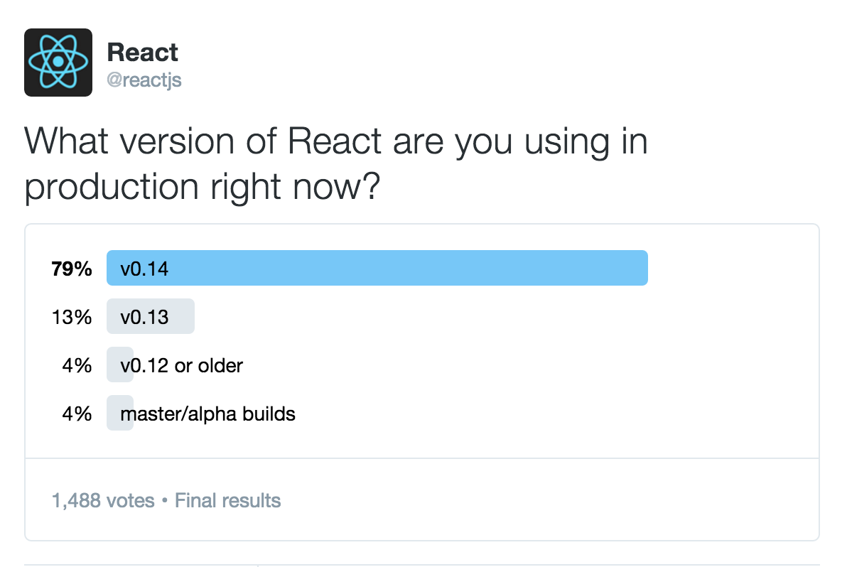 Today we’re announcing that we’re switching to major revisions for React. The current version is 0.14.7. The next release will be: 15.0.0